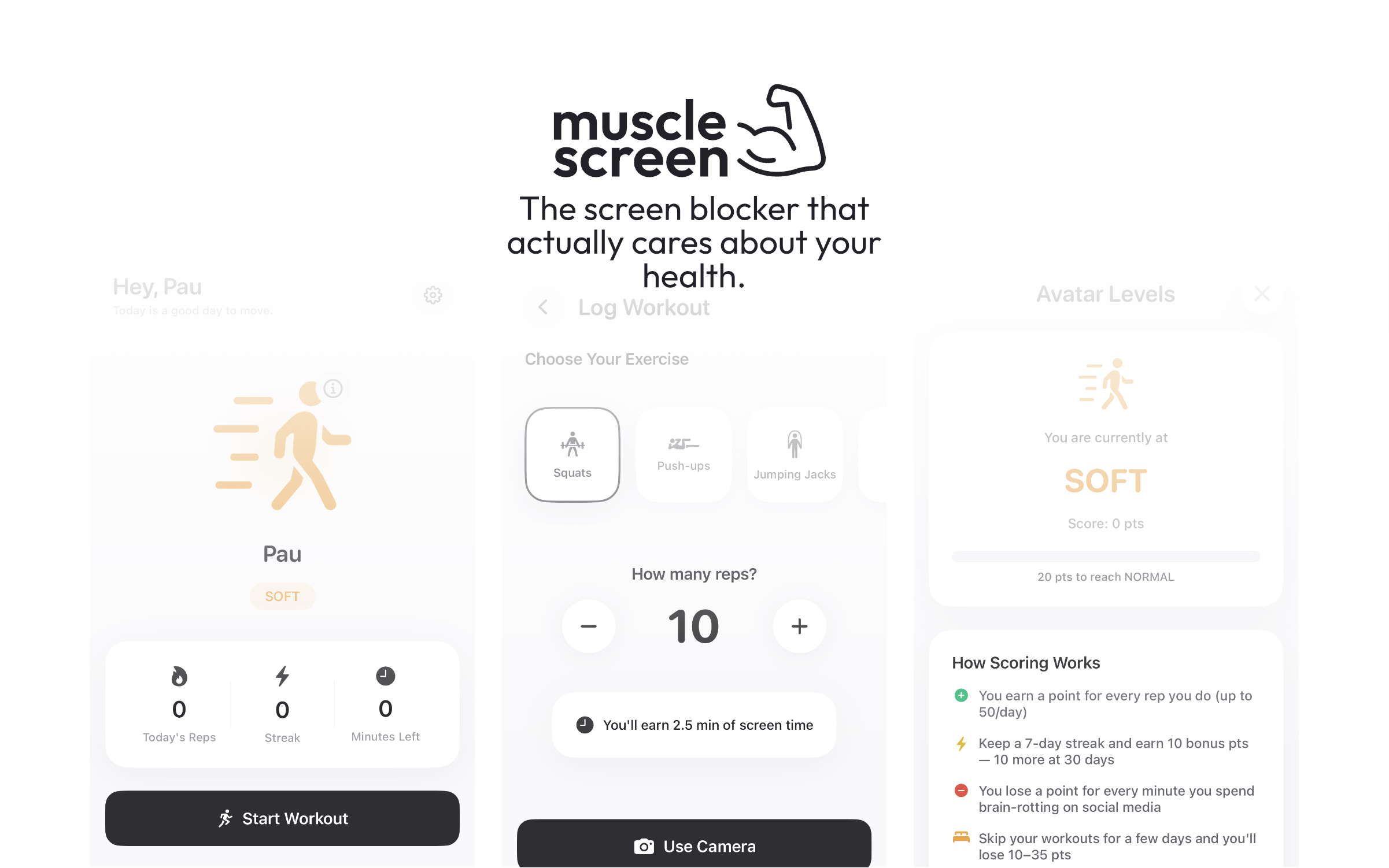 MuscleScreen redéfinit la relation entre le temps d'écran et la santé physique. En intégrant l'exercice dans le comportement le plus habituel de la vie moderne (prendre son téléphone) il supprime le besoin de motivation séparée. Le système d'avatar crée de véritables enjeux émotionnels, et la vérification par caméra maintient les utilisateurs honnêtes sans nécessiter de matériel supplémentaire.